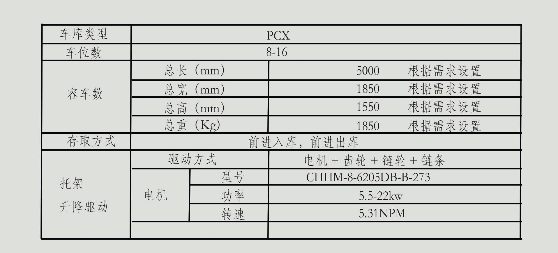 通過減速電機帶動傳動機構(gòu),在牽引鏈條上,每隔一定距離安裝一個存車拖架,存車拖架隨鏈條一起作循環(huán)運動,從而達到存取車輛的目的。